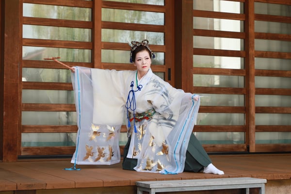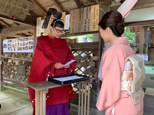 例祭が始まり、宮司様が祝詞を唱えられると風がふわっと吹き、神様が降りてこられたような気持ちがいたしました。その風は巫女さんの舞が始まった時にも同じように吹き、神様のご加護を頂戴したようでとても気持ちが引き締まる思いでした。