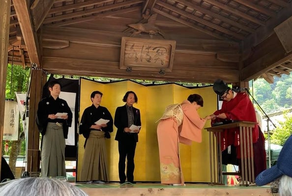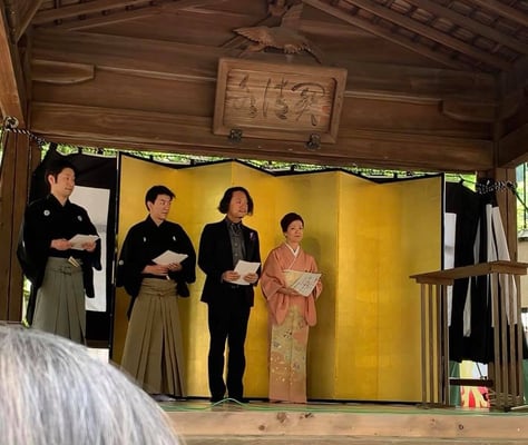わたくしは、関蝉丸神社芸能祭の第1回目に出演させていただき、この度は令和元年に、第1回目の芸能大使に任命され、何とも嬉しいお役目を頂戴いたしました。